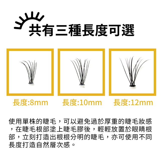 ■專業美容工具 多根濃密 交叉加翹型 ■商品尺寸: 厚度0.10 / 捲翹度C / 1株10根 共三種長度8mm / 10mm / 12mm ■商品規格:60朵/盒