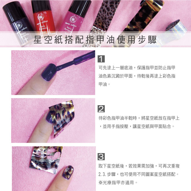 使用不同圖案的星空紙與指甲油做搭配,會有意想不到的效果
