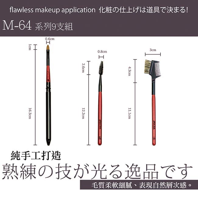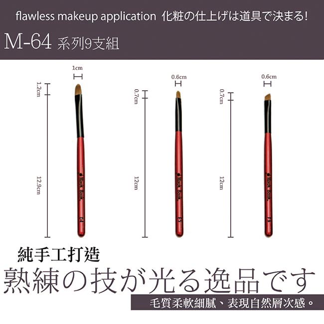 堅持手工、獾纖毛質,觸感柔軟輕鬆好上妝,奈米科技研發、抗菌抗敏,呵護肌膚,畫出自然妝感。