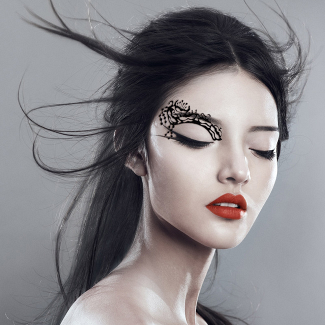 絲絨做的假睫毛,黏在眼上的眼皮,就像立體浮雕的感覺,利用華麗的造型佈滿整個眼窩,適合用於表演、特殊場合使用。
